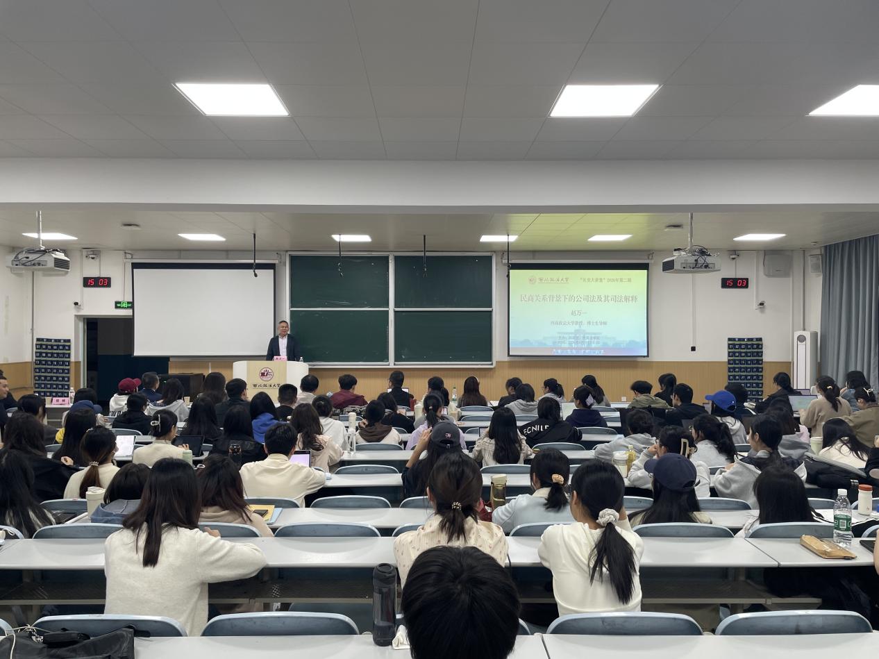 4月11日下午,由科研处、民商法学院联合主办的“长安大讲堂”2026年第二期在我校长安校区成功举办。西南政法大学学位委员会副主席赵万一教授应邀作题为《民商关系背景下的公司法及其司法解释》的学术报告,我校副校长马朝琦出席并致辞。讲座由科研处处长倪楠主持,近200名师生到场聆听。